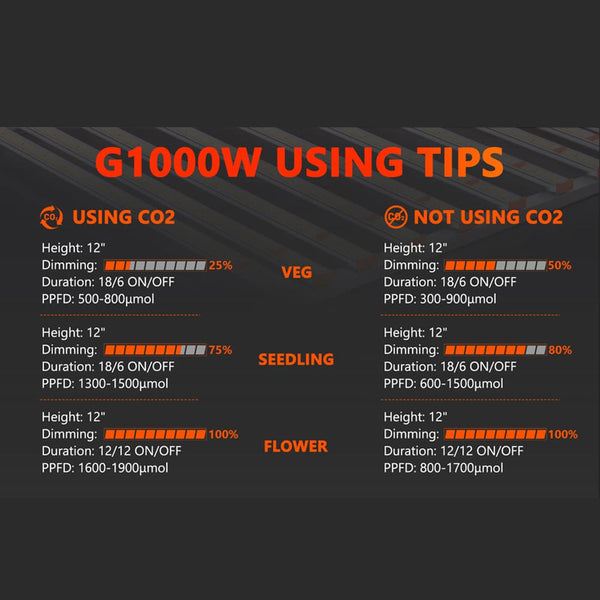 From seed to harvest, the G1000W offers a complete spectrum of light with adjustable dimming capabilities. The dimming knob allows you to customize the light intensity according to the specific phase of your plants’ growth cycle. With a range of 3200-4200K, 4800-5000k and 650-665nm, your plants will receive the ideal light spectrum they need to thrive.
